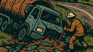 経済・ビジネス 悪臭と危機:トラック横転で腐敗魚2万リットルが小川に流出、運転手救出続く